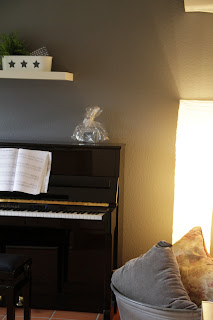 Spiel- und Musikzimmer neu zu streichen und etwas zu entrümpeln. Zusätzlich haben wir auf Wunsch unserer Kinder auf unserem Spielpodest den alten Spielteppich mit aufgemalten Autostrassen gegen einen neuen, schlichten Teppich ersetzt.